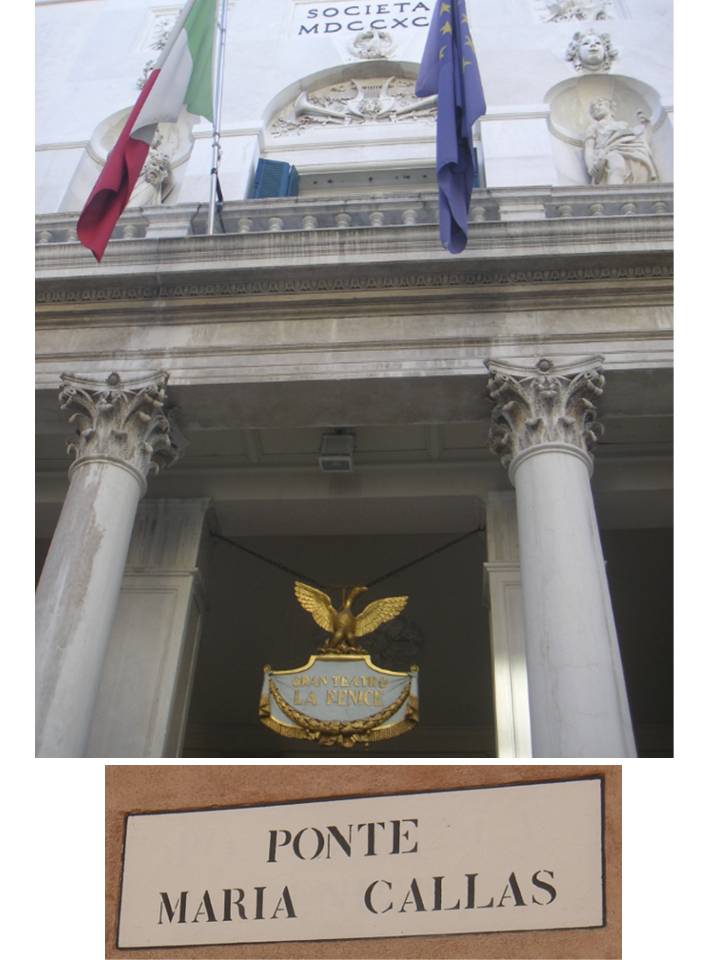 上演直前のミラノ・スカラ座内部、 ヴェネツィア・フェニーチェ劇場入口と近くの「マリア・カラス橋」標識