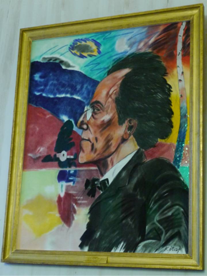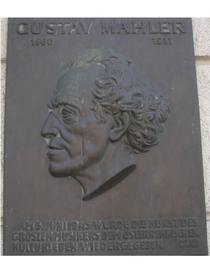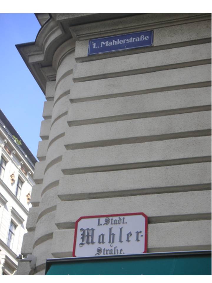 デフォルメされたマーラー肖像画(ウィーン国立歌劇場フォワイエにて)、”マーラー通り”の標識(ウィーン・ムジークフェライン近く)