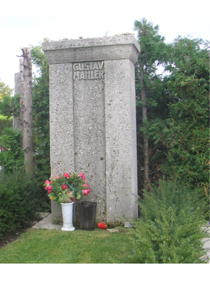 (左から)マーラーのレリーフ(ウィーン・コンツェルトハウス入口)、マーラーのお墓(ウィーン・グリンツィング墓地)、